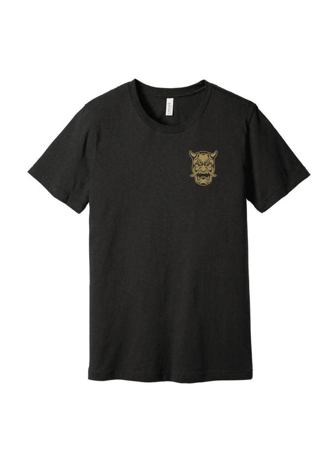 Gold print on a black shirt.